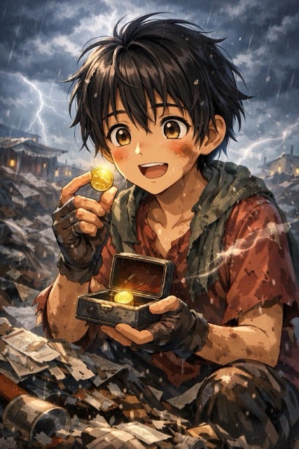 In an anger he pushed a pile of newspapers. Beneath the newspapers he heard a different sound. The sound was metallic. He dug further to see it was a small box. A jewellery box.He opened it with great difficult to see A shining yellow coin inside. Even in the dim evening light, it glowed. Not like ordinary metal. It had a rich, warm shine the kind he had only seen in shop windows from far away. Monu stared at it, eyes wide, unable to blink.